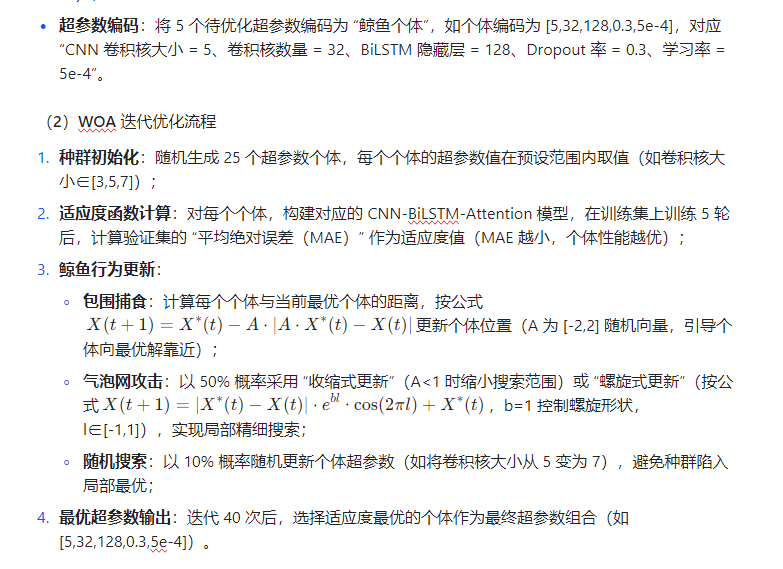 - 单变量适配优势:单变量模型超参数维度相对低(5-8 维),WOA 无需大规模种群即可实现高效寻优,避免传统群智能算法的计算冗余,同时其全局搜索能力可规避局部最优陷阱;