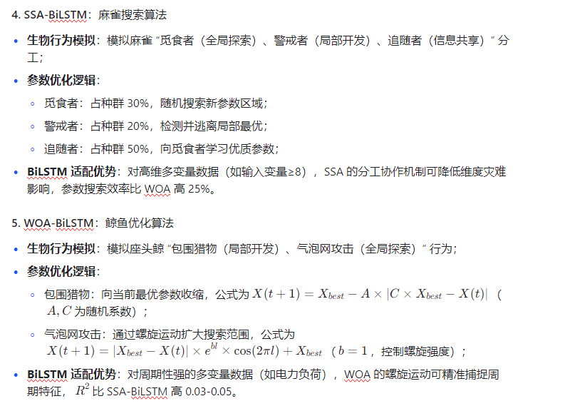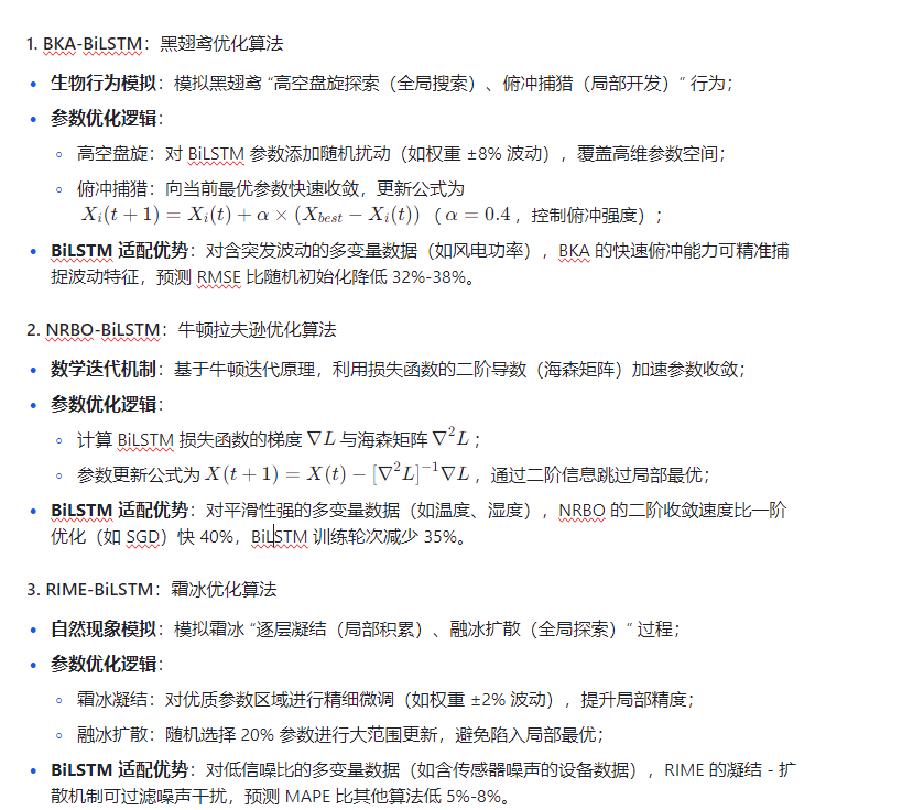 各优化算法通过独特的寻优机制优化 BiLSTM 的关键参数(各层权重、偏置、学习率),解决 BiLSTM 的参数痛点,其核心差异体现在 “探索 - 利用平衡”“收敛速度”“高维适配性” 三方面,适配不同多变量时序数据特性。