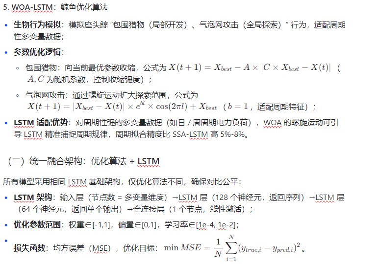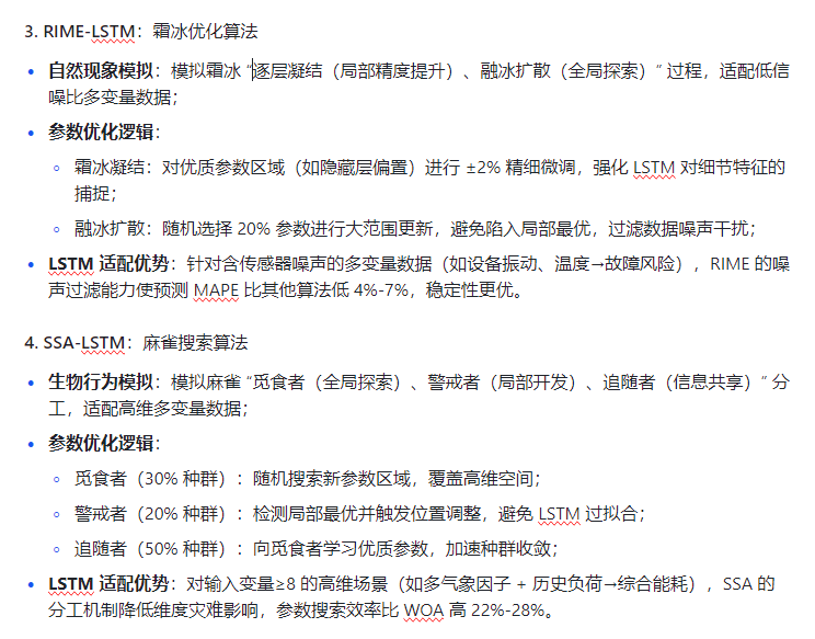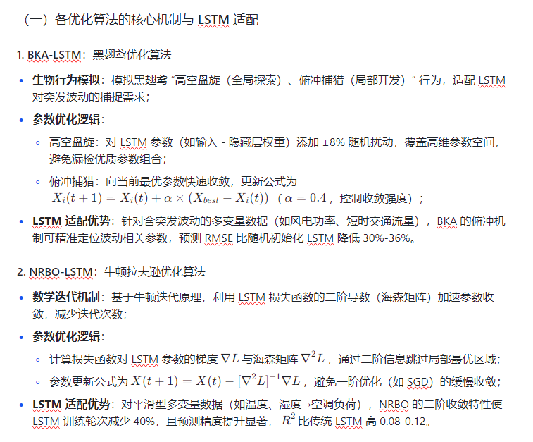 各优化算法通过独特寻优机制,优化 LSTM 的关键参数(各层权重、偏置、学习率),解决 LSTM 参数初始化痛点。核心差异集中在 “全局探索广度”“局部开发精度”“收敛速度”,适配不同多变量时序数据特性,且均基于 LSTM 单向时序建模架构,确保对比公平性。