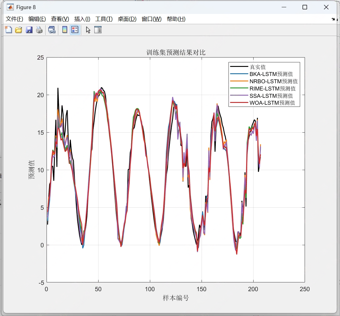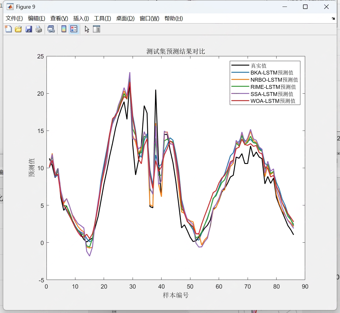 在能源调度、环境监测、金融趋势分析等多变量时序预测场景中,LSTM(长短期记忆网络)凭借对时序依赖的建模能力成为常用模型,但随机初始化权重 / 偏置易导致模型陷入局部最优,影响预测精度。黑翅鸢优化(BKA)、牛顿拉夫逊(NRBO)、霜冰优化(RIME)、麻雀搜索(SSA)、鲸鱼优化(WOA)五种算法,分别从生物行为、数学迭代、自然现象角度提供全局寻优能力。本文构建 “5 种优化算法 + LSTM” 的多变量时序预测模型,设计 “一键对比” 框架,通过统一标准、自动化流程验证各模型性能,为场景化选型提供依据。