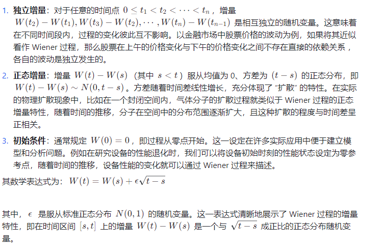 Wiener 过程,又被称作布朗运动,在随机过程理论里占据着极为关键的位置。1827 年,英国植物学家罗伯特・布朗(Robert Brown)在显微镜下观察到悬浮在液体中的花粉颗粒进行着无规则的运动 ,这便是布朗运动的首次发现。直到 1905 年,爱因斯坦从物理学角度对其进行了解释,1918 年诺伯特・维纳(Norbert Wiener)将其精确地数学公式化,自此 Wiener 过程成为了一个严格定义的数学概念。