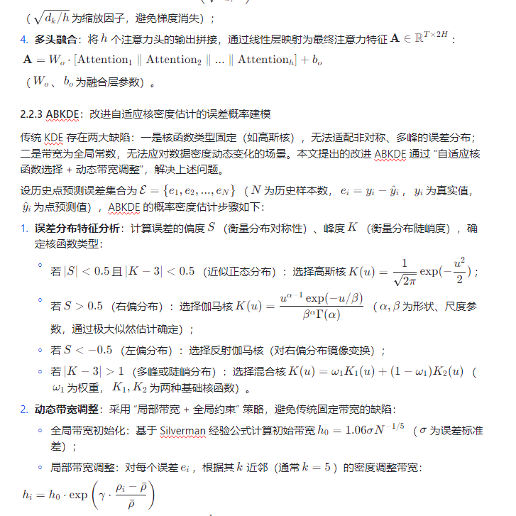 - 误差概率建模层:采用改进的 ABKDE 对历史点预测误差进行概率密度估计,动态生成不同置信水平(如 90%、95%、99%)下的区间预测结果,并输出区间对应的概率分布。