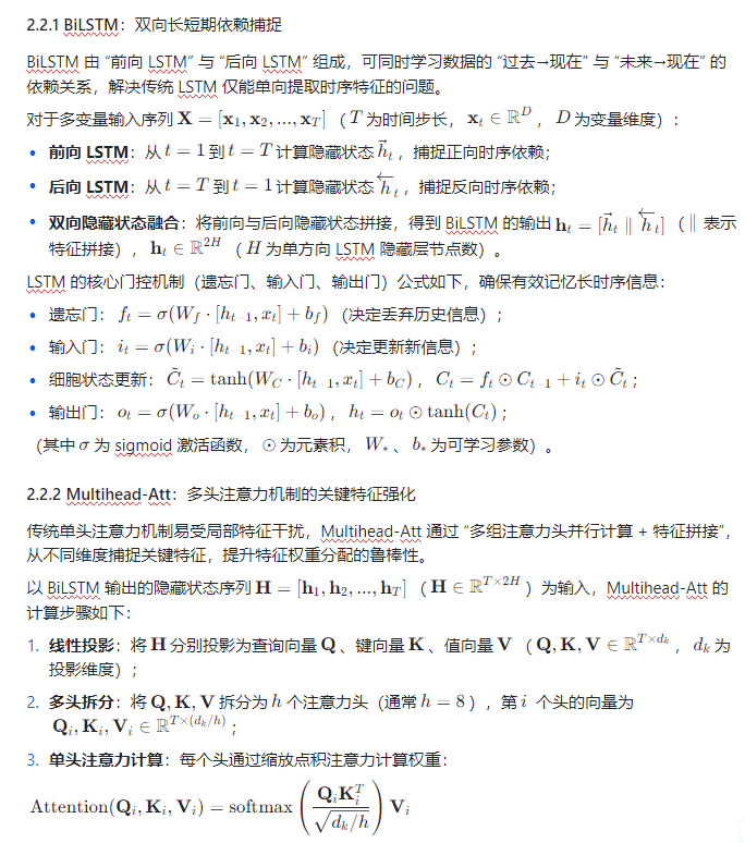 - 多变量特征提取层:输入多变量时序数据,通过 BiLSTM 学习双向时序依赖,再经 Multihead-Att 聚焦关键特征,输出高维融合特征;