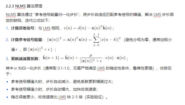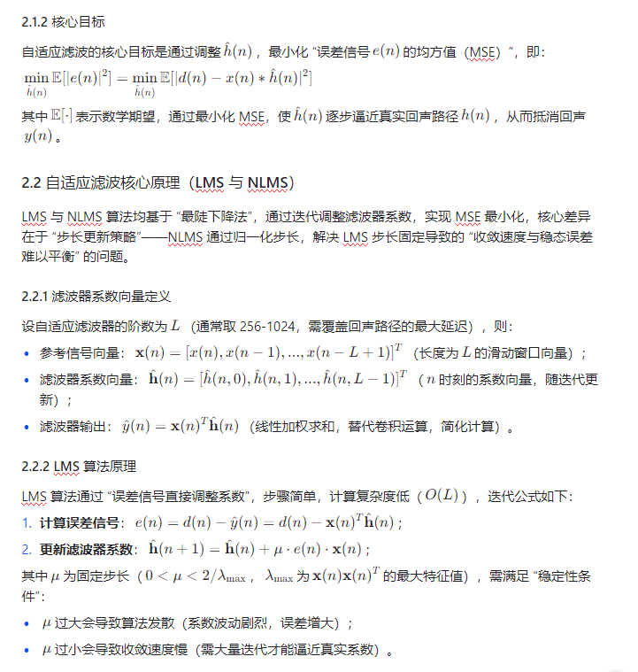 传统回声消除方法(如固定滤波器)难以适配动态变化的声学环境(如房间混响特性变化、设备位置移动),而自适应滤波算法(如 LMS、NLMS)可通过实时调整滤波器系数,动态逼近回声路径的脉冲响应,实现精准的回声抵消。其中,LMS 算法结构简单、计算复杂度低,适合资源受限设备;NLMS 算法通过归一化调整步长,收敛速度更快、稳定性更强,适用于对实时性要求较高的场景。