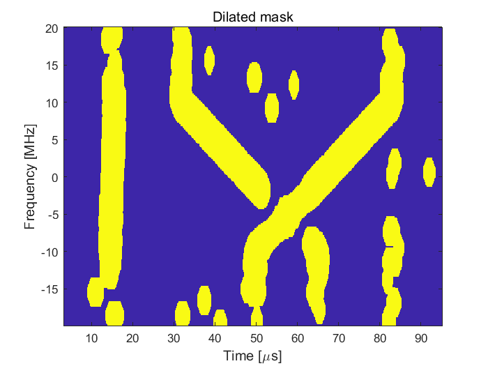 )域中,通过沿每个频率单元(frequency bin)部署一维(1-D)CFAR 检测器,可实现对干扰频谱的检测;随后,将检测得到的图谱膨胀(dilated)为掩码,用于干扰抑制。