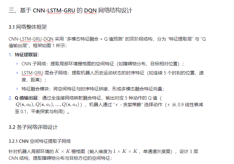 深度 Q 网络(Deep Q-Network, DQN)通过 “深度神经网络拟合 Q 值函数”,结合强化学习的试错机制,实现未知环境中的自主决策,为动态路径规划提供新思路。然而,传统 DQN 仅采用 CNN 提取环境空间特征,难以捕捉机器人运动的时间关联性(如历史位置、速度对当前决策的影响);单一 LSTM 或 GRU 虽能处理时序数据,但存在长序列梯度消失或短期记忆不足的问题。