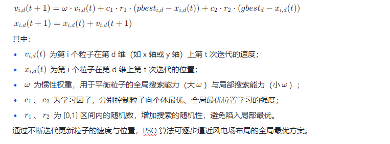 - 适应度函数(Fitness Function):用于评价粒子(布局方案)的优劣,在风电场优化中,通常以 “风电场总发电功率最大化”“尾流损失最小化” 或 “单位土地面积发电功率最大化” 作为适应度函数的核心目标;