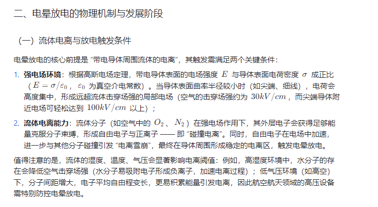 在电力系统、航空航天、环境工程等领域,电晕放电的研究具有重要的理论与工程价值:一方面,高压输电线路、高压设备绝缘子表面的电晕放电会导致电能损耗(即 “电晕损耗”)、产生电磁干扰(影响无线电通信与电力系统自动化设备),还可能因长期局部发热加速绝缘老化,引发设备故障;另一方面,通过主动利用电晕放电的物理化学特性,可实现静电除尘、废气净化、臭氧制备等环保应用,以及等离子体推进、静电喷雾等特种工程技术。因此,深入理解电晕放电的物理机制与电磁特性,既是抑制其负面影响的基础,也是拓展其正向应用的关键。