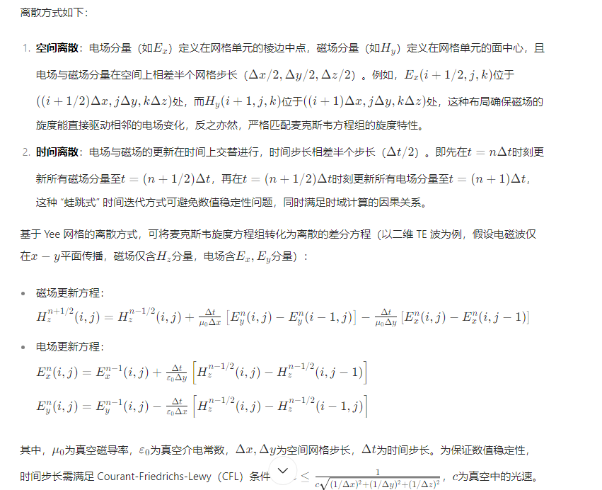 时域有限差分法(Finite-Difference Time-Domain, FDTD)作为一种直接求解麦克斯韦方程组的数值方法,具有时域与空域双重离散、可直观观测电磁波动态传播过程的优势。而 Yee 网格算法作为 FDTD 的核心离散方案,通过将电场分量与磁场分量在空间和时间上交替采样,天然满足麦克斯韦方程组的旋度关系,为精准模拟电磁波的产生、传播与干涉提供了理想的离散框架。