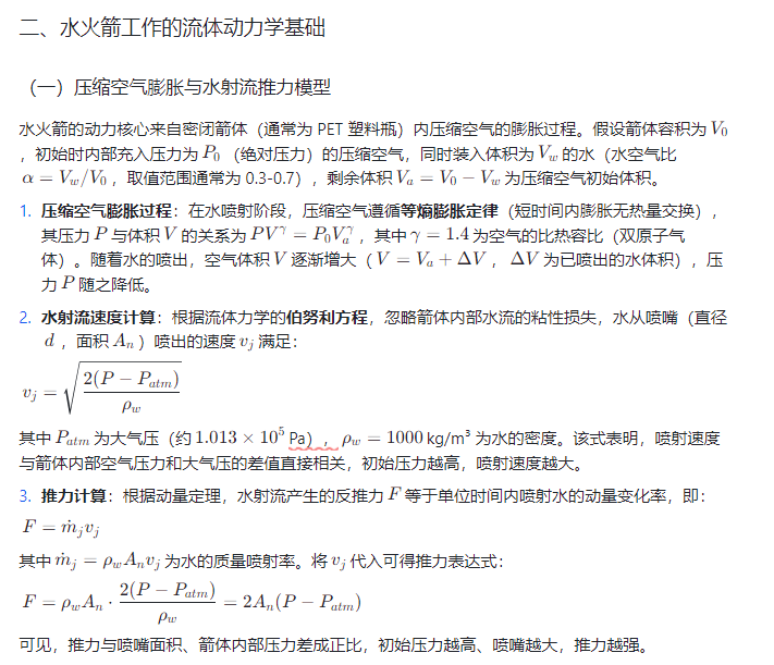 水火箭作为一种以水为推进剂、压缩空气为动力源的低成本推进装置,其发射性能(最大高度、飞行速度、着陆时间)与流体动力学特性紧密耦合。从流体力学视角看,水火箭的工作过程本质是压缩空气的膨胀功转化为水的动能,进而通过水的喷射产生反推力的过程,涉及压缩气体流动、液体射流、气液两相耦合及外部空气阻力等多物理现象。