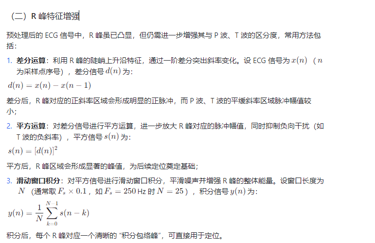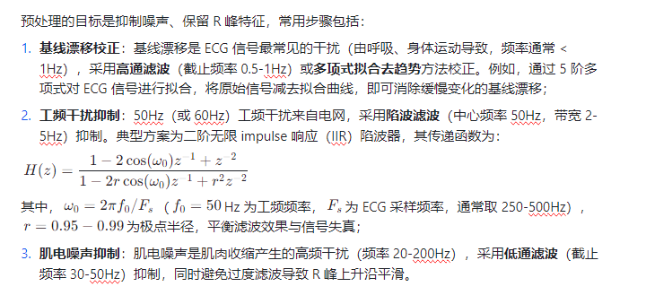 ECG 信号在采集过程中易受噪声干扰(如 50Hz 工频干扰、肌电噪声、基线漂移),需先通过预处理增强 R 峰特征,再采用检测算法定位 R 峰。完整流程包括 “信号预处理→特征增强→R 峰定位→伪峰剔除” 四个阶段。