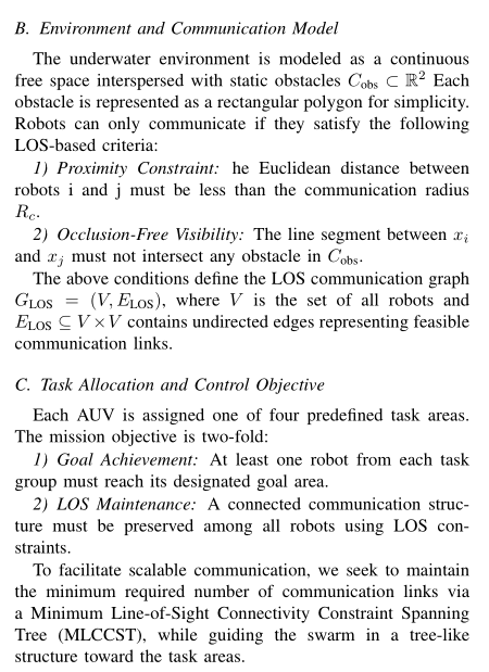 由于水声通信存在局限性、海洋环境动态变化且存在物理障碍物,因此维持水下自主航行器(AUVs)之间可靠的通信与协同是一项基础性挑战。本研究在 MATLAB 仿真水下环境中,对 “最小视距连通约束生成树(MLCCST)” 框架进行了部分复现。该系统将 AUVs 建模为点机器人,使其在严格的视距(LOS)通信约束下运行,仿真实时中继编队与分布式协同过程。
