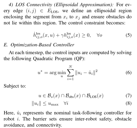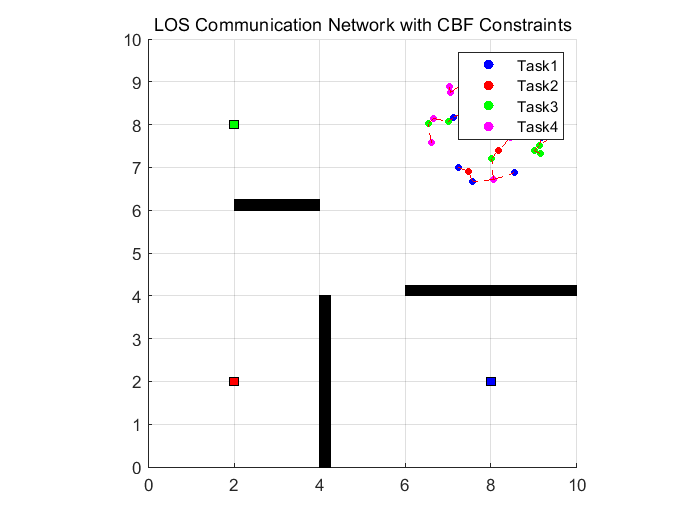 在通过动态生成的 MLCCST 维持全局及子群连通性的同时,机器人被分配至不同任务区域。当抵达目标区域后,部分 AUVs 形成圆形编队,其余 AUVs 则作为中继节点,以维持基于视距的通信链路。尽管该仿真成功对动态树生成与自适应中继分配进行了建模,但用于避障的控制屏障函数(CBFs)的实现仍存在局限性,尤其在复杂障碍物环境中表现更为明显。