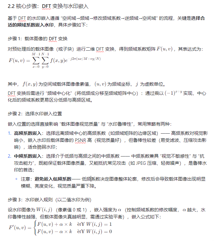 - 可逆性基础:DFT 具有 “正变换 - 逆变换” 的可逆性,只要嵌入过程对频域系数的修改是可控的,就能通过逆 DFT(IDFT)恢复载体图像并提取水印(部分场景下)。