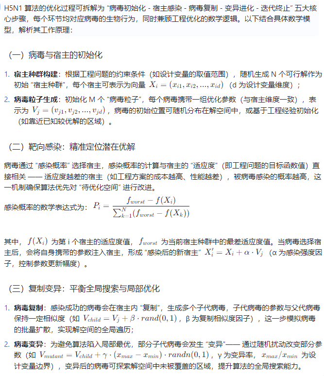 H5N1 算法的优化过程可拆解为 “病毒初始化 - 宿主感染 - 病毒复制 - 变异进化 - 迭代终止” 五大核心步骤,每个环节均对应病毒的生物行为,同时兼顾工程优化的数学逻辑。以下结合具体数学模型,解析其工作原理: