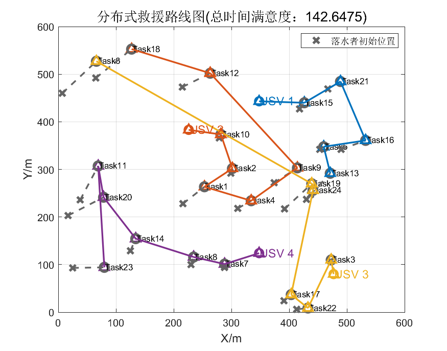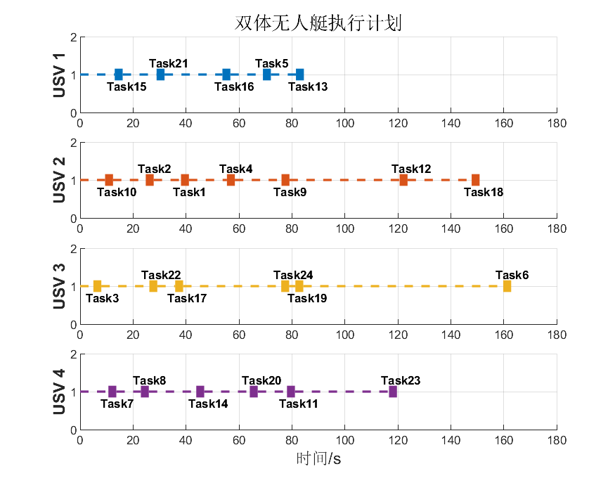 这类任务的核心诉求,是在复杂海事环境下(如多变海流、有限通信带宽、任务目标动态变化),实现双无人艇的高效协同,而 **“总时间满意度”** 是衡量任务规划效果的关键指标 —— 即通过合理分配任务、规划路径,让双无人艇完成所有任务的总时间尽可能短,同时满足任务对时间的要求(如搜救任务需在 “黄金救援时间” 内完成),最终提升任务执行的时效性与可靠性。然而,双无人艇分布式协同任务规划面临两大核心挑战:一是分布式决策的一致性,由于无人艇各自获取局部环境信息,需在无中心控制节点的情况下,通过信息交互达成任务分配与路径规划的共识;二是时间满意度的最大化,需平衡两艘无人艇的任务负载,避免单艇任务过重导致总时间延长,同时考虑海流、风浪等环境因素对无人艇航行速度的影响,确保总时间符合任务预期。