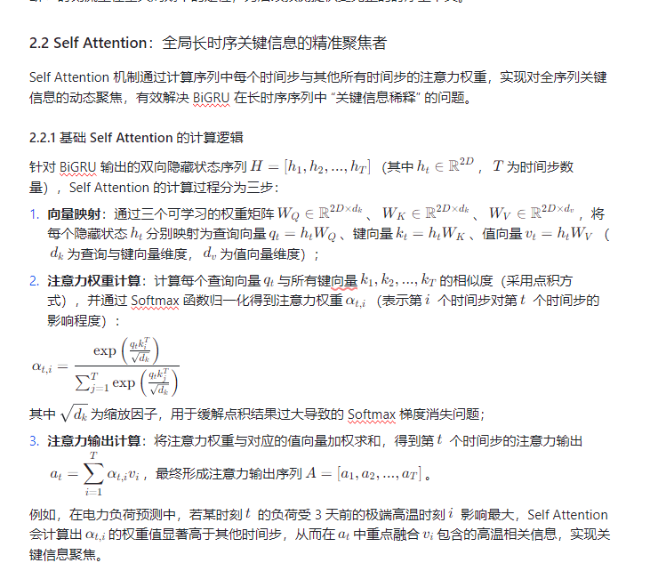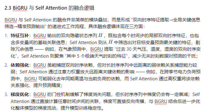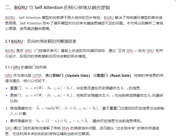 BiGRU - Self Attention 模型正是针对这三大诉求设计,通过 BiGRU 满足双向时序覆盖需求,借助 Self Attention 实现长时序关键定位与多变量冗余过滤。