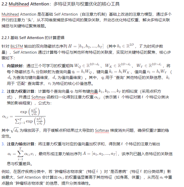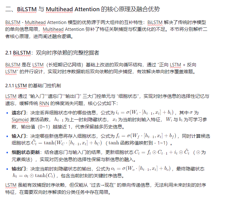 在金融风险识别、医疗疾病诊断、工业设备故障检测等关键领域,数据多特征分类预测(多输入单输出)是实现精准决策的核心技术支撑。此类任务中,输入数据往往包含多维度特征(如金融数据中的股价、成交量、利率,医疗数据中的生理指标、影像特征,工业数据中的温度、压力、振动值),且部分特征存在显著的时序依赖性,同时不同特征对分类结果的影响权重差异极大。传统分类模型如 CNN 仅能提取局部特征,难以处理时序关联;单一 LSTM 虽能捕捉时序依赖,却无法兼顾双向时序信息且易忽略关键特征的重要性;普通 Attention 机制虽能聚焦关键信息,但对多特征复杂关联的捕捉能力有限。在此背景下,BiLSTM(双向长短期记忆网络)与 Multihead Attention(多头注意力机制)的融合模型应运而生 ——BiLSTM 通过双向循环结构完整挖掘时序数据的前后依赖关系,Multihead Attention 则从多维度聚焦不同特征及特征间的关键关联,二者协同实现 “双向时序特征提取 + 多特征权重优化” 的分类预测能力,为数据多特征分类预测(多输入单输出)难题提供了更优解决方案。本文将从模型原理、构建流程、实验验证到实际应用,全面解析该融合模型的技术细节与优势。