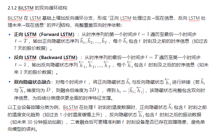 - 双向时序覆盖难题:传统单向 LSTM 仅能从 “过去→现在” 的方向挖掘时序依赖,无法利用未来时刻的时序信息辅助当前特征解读。例如,在判断某时刻工业设备是否异常时,不仅需要参考该时刻之前的温度变化(过去信息),还需结合该时刻之后的振动数据(未来信息)—— 若之后振动数据骤增,可反向印证当前时刻已存在异常隐患,单向模型则会遗漏这一关键信息。