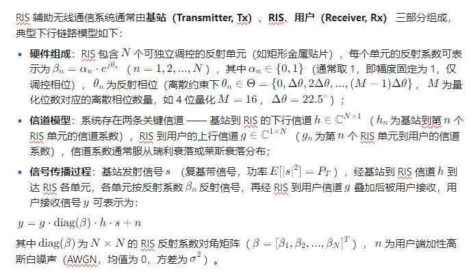 RIS 辅助无线通信系统通过 RIS 对入射信号的反射调控,构建基站 - RIS - 用户的间接通信链路,其核心是通过波束成形优化 RIS 反射相位,最大化用户接收信号功率。需先明确系统模型与离散波束成形的优化目标及挑战。