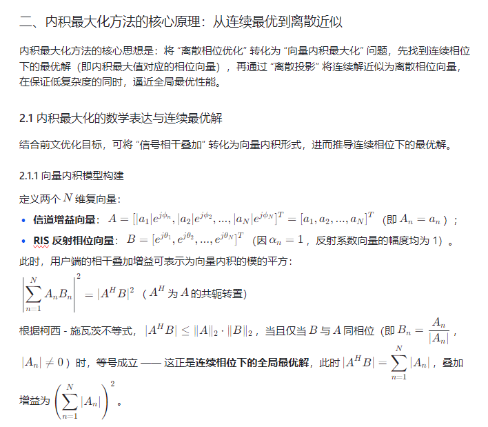 在 5G/6G 无线通信中,复杂的传播环境(如城市建筑群遮挡、多径衰落)导致信号衰减严重,传统基站增配、功率提升等方案面临成本高、能耗大的瓶颈。而智能超表面(Reconfigurable Intelligent Surface, RIS) 作为一种新型智能反射器件,可通过调控单元反射系数(幅度与相位)构建可控的 “虚拟视距链路”,显著提升通信链路质量。其中,RIS 的波束成形优化是核心技术 —— 由于 RIS 硬件单元的反射相位通常只能取离散值(如 4 位量化对应 16 个离散相位),离散波束成形优化成为 RIS 辅助通信的关键难题。传统优化方法(如穷举搜索、贪心算法)要么复杂度高、要么精度不足,而内积最大化方法凭借其对 “信号相干叠加” 的精准刻画,能在离散约束下高效找到近似最优的 RIS 反射相位矩阵,为 RIS 辅助无线通信的性能提升提供了高效解决方案。本文将从 RIS 通信模型、内积最大化原理、离散波束成形优化流程到性能验证,全面解析该优化方法的技术细节与应用价值。