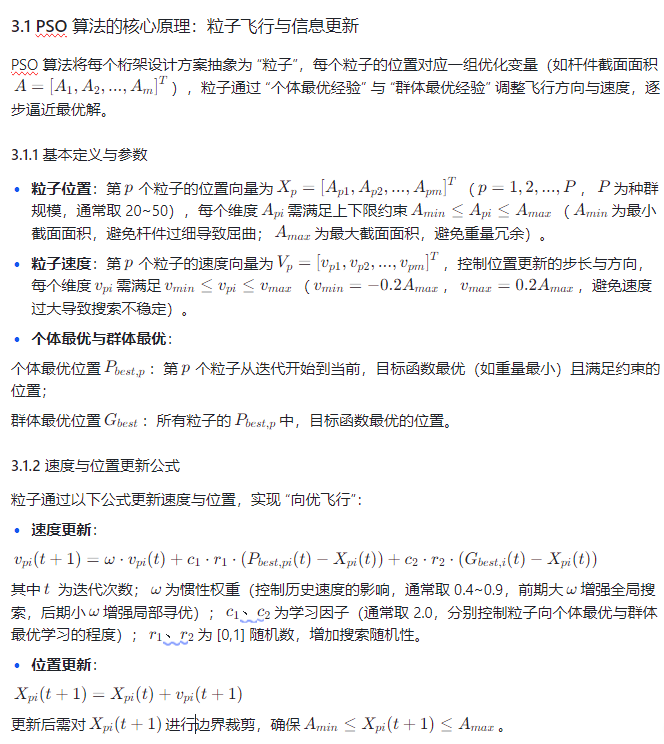 粒子群优化是一种源于 “鸟群觅食行为” 的智能优化算法,通过模拟粒子(代表设计方案)在搜索空间中的 “飞行” 与 “信息共享”,快速寻找最优解。相较于传统优化方法(如梯度下降法、惩罚函数法),PSO 无需梯度信息、全局搜索能力强、收敛速度快,尤其适用于桁架优化这类 “高维度、非线性、多约束” 的复杂问题。