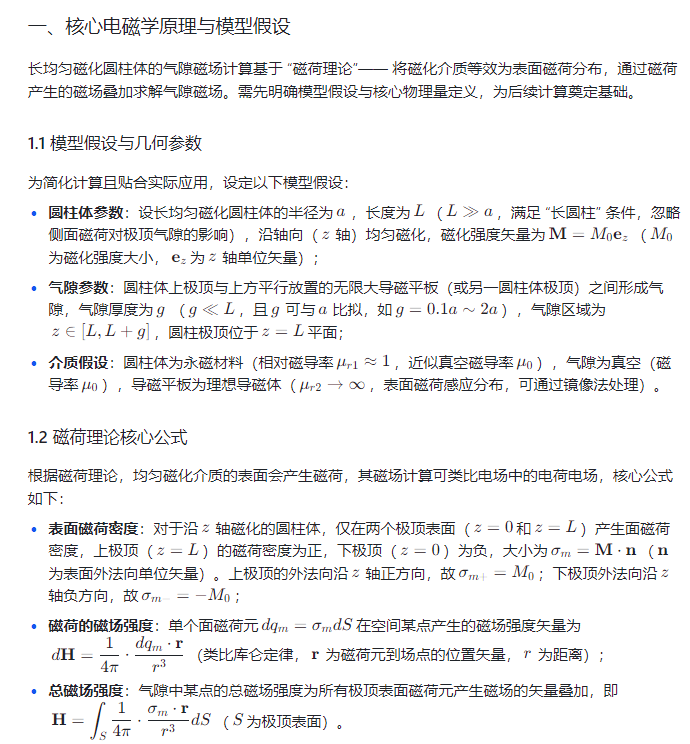 在永磁体应用(如核磁共振成像、磁悬浮系统、永磁电机)中,长均匀磁化圆柱体的极顶气隙磁场是决定设备性能的关键参数。传统分析方法中,“点状磁单极近似” 因模型简单被广泛使用,但忽略了磁荷的实际分布,在气隙较小时误差显著;而 “单极表面电荷密度方法” 通过精准刻画圆柱极顶的磁荷分布,能更准确计算气隙磁场,为高精度永磁设备设计提供理论支撑。本文将从电磁学原理出发,详细拆解单极表面电荷密度方法的数值计算流程,对比其与点状磁单极近似的结果差异,明确两种方法的适用边界与误差来源。