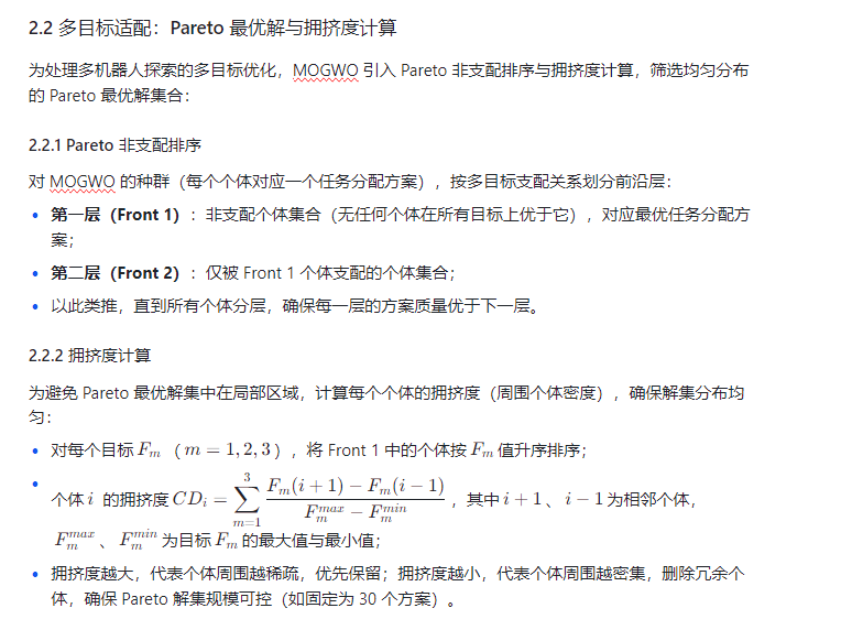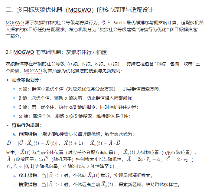 未知环境探索(如灾后救援、深空探测、地下矿洞测绘)场景中,多机器人系统通过协同作业可提升探索效率与覆盖范围,但任务分配需平衡 “探索覆盖最大化、任务耗时最小化、机器人能耗均衡” 等多目标需求,同时应对环境动态性(如障碍物突发出现、机器人故障)与资源约束(如电池容量有限)。传统任务分配方法(如贪心算法、匈牙利算法)难以处理多目标冲突与复杂约束,易出现 “局部最优分配” 或 “资源浪费” 问题。多目标灰狼优化器(Multi-Objective Grey Wolf Optimizer, MOGWO) 模拟灰狼群体的 “围捕 - 狩猎” 协作行为,结合 Pareto 最优解排序机制,能在多目标解空间中高效搜索全局最优分配方案,为多机器人探索的任务分配提供自适应、高鲁棒性的解决方案。本文将从多机器人探索任务建模、MOGWO 算法适配、任务分配流程、实验验证四方面,解析该策略如何实现多目标协同的机器人任务高效分配。