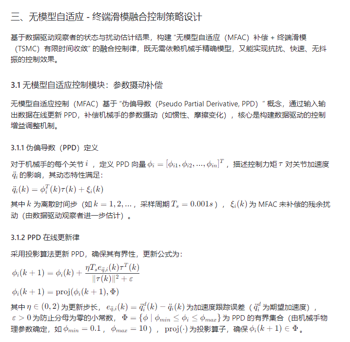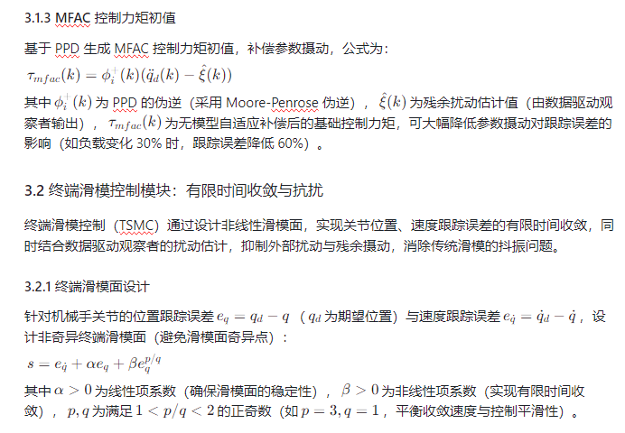 刚性机器人机械手在工业装配、精密制造、物流分拣等领域应用广泛,其控制核心是在 “参数摄动(如负载变化、关节摩擦系数漂移)”“外部扰动(如装配反力、传送带振动)”“无精确数学模型” 等约束下,实现关节位置、速度的高精度跟踪。传统控制方法(如 PID、模型预测控制)依赖精确的机械手动力学模型,面对复杂扰动时鲁棒性不足;单一滑模控制虽抗扰能力强,但易产生 “抖振” 且需已知扰动边界;无模型自适应控制虽无需模型,但对未建模动态的估计精度有限。数据驱动观察者 - 无模型自适应 - 终端滑模控制(Data-Driven Observer-Based Model-Free Adaptive Terminal Sliding Mode Control, DDO-MFAC-TSMC) 融合方案,通过数据驱动观察者实时估计系统状态与扰动,无模型自适应补偿参数摄动,终端滑模控制实现有限时间收敛,三者协同解决刚性机械手的 “无模型、抗扰动、高精度” 控制难题。本文将从机械手动力学特性、数据驱动观察者设计、控制策略构建、稳定性验证四方面,解析该方案的技术细节与控制优势。