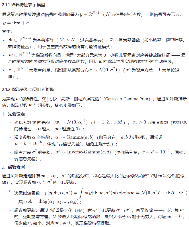稀疏贝叶斯学习是基于贝叶斯框架的稀疏建模方法,通过引入 “稀疏先验” 自动选择关键特征,抑制噪声干扰,同时利用概率模型量化诊断不确定性,天然适配复合轴承故障诊断的 “特征稀疏性”“小样本”“强噪声” 需求。