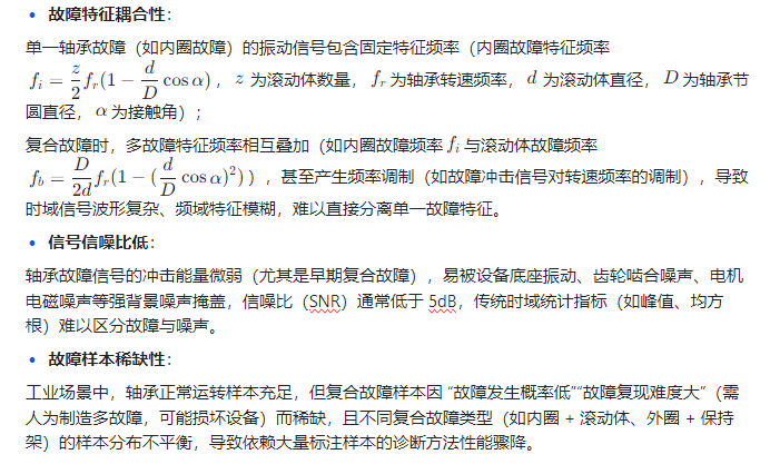 复合轴承故障是指轴承同时存在两种及以上单一故障(如内圈剥落 + 滚动体磨损、外圈裂纹 + 保持架松动),其故障信号与诊断需求具有显著特殊性,需先明确特性与难点,为稀疏贝叶斯学习方法的适配设计奠定基础。