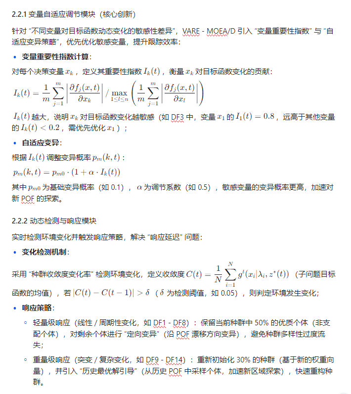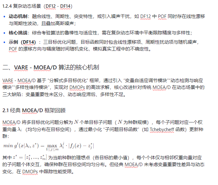 在实际工程场景(如动态路径规划、实时资源调度、自适应控制)中,多目标优化问题常随时间演化(如目标权重变化、约束边界移动、参数摄动),这类问题被称为动态多目标优化问题(Dynamic Multi - Objective Optimization Problems, DMOPs)。传统静态多目标优化算法(如 NSGA - 2、MOEA/D)因缺乏动态响应机制,难以跟踪随时间漂移的 Pareto 最优解(Pareto Optimal Set, POS)与 Pareto 最优前沿(Pareto Optimal Front, POF)。带变量自适应调节的多目标进化算法(Variable Adaptive Regulation Enhanced MOEA/D, VARE - MOEA/D)在经典 MOEA/D 框架基础上,引入 “变量重要性感知”“动态响应策略” 与 “种群多样性维持” 机制,能高效应对 DMOPs 的动态特性。本文以 CEC2018 动态多目标测试集(DF1 - DF14)为基准,从算法原理、测试集特性、实验设计、结果分析四方面,系统验证 VARE - MOEA/D 在动态多目标优化中的优越性。