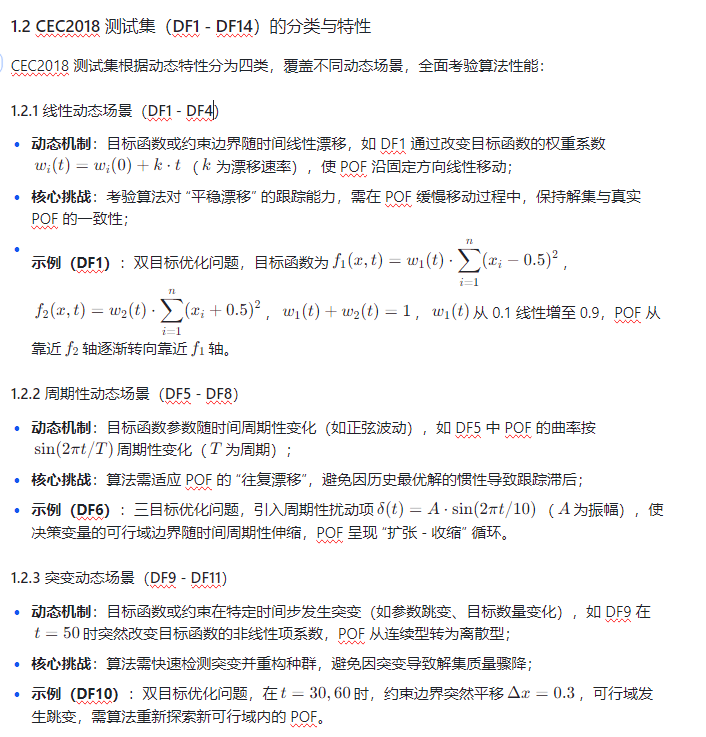 DMOPs 的核心挑战在于 “目标函数 / 约束随时间动态变化”,需算法具备 “快速响应变化”“精准跟踪 POF”“维持种群多样性” 三大能力。CEC2018 测试集(DF1 - DF14)作为国际公认的 DMOPs 评测基准,涵盖多种动态场景,为算法性能验证提供标准化平台。