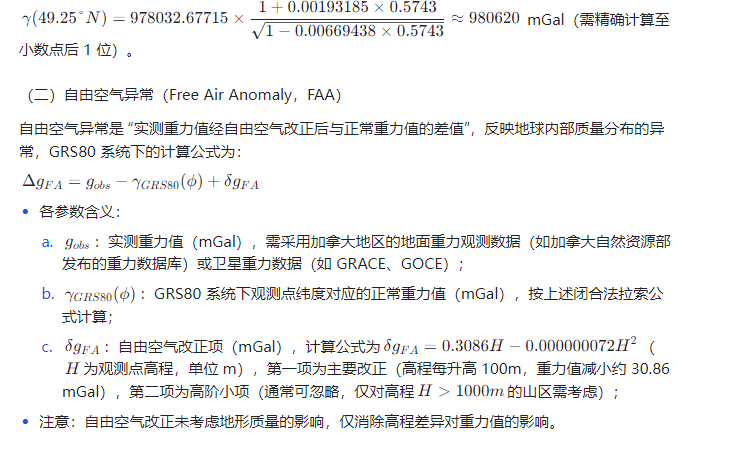 在重力勘探、大地测量与地球物理研究中,加拿大地区(经纬度范围约 41°N-83°N,52°W-141°W)的重力场计算需结合其复杂地形(西部落基山脉、东部拉布拉多高原、中部平原)与高精度重力场模型。本文围绕 “GRS67/GRS80 正常重力计算、GRS80 自由空气异常计算、EIGEN-CG03C 模型应用、剩余地形改正计算” 四大核心任务,提供完整计算流程与参数取值,为加拿大地区的重力数据处理与地质解释提供技术支撑。