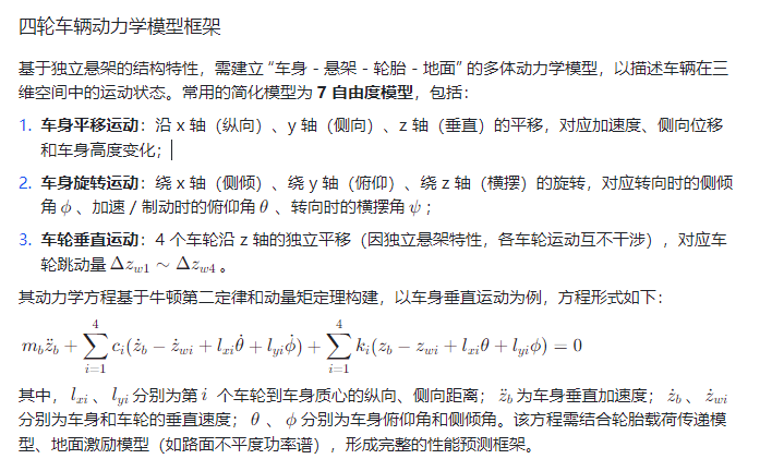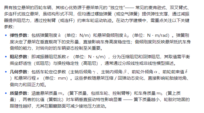 在汽车工程领域,车辆动力学是研究车辆在行驶过程中受力与运动关系的核心学科,其分析结果直接决定了车辆的操控稳定性、动力性、制动安全性和乘坐舒适性。而悬架系统作为连接车身与车轮的关键部件,是车辆动力学性能的 “调节器”—— 其中,独立悬架凭借 “各车轮独立运动、互不干涉” 的特性,相比非独立悬架更能适应复杂路况,为四轮车辆在加速、制动、转向等动态场景下的性能优化提供了更大空间。