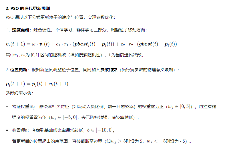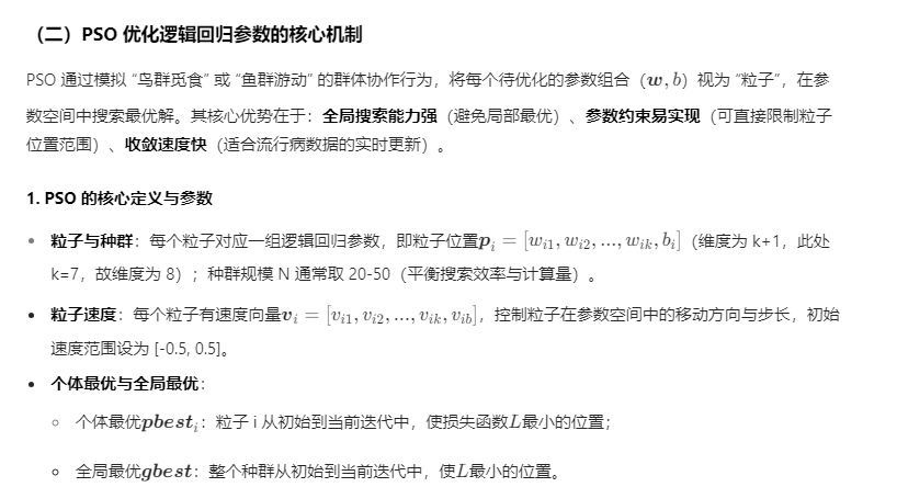 粒子群优化(Particle Swarm Optimization, PSO)作为一种全局随机优化算法,通过模拟群体中粒子的协作搜索行为,能有效规避局部最优,且可天然融入参数约束。将 PSO 用于逻辑回归的参数优化,可显著提升流行病建模的精度与鲁棒性,为动态传播场景提供更优解决方案。