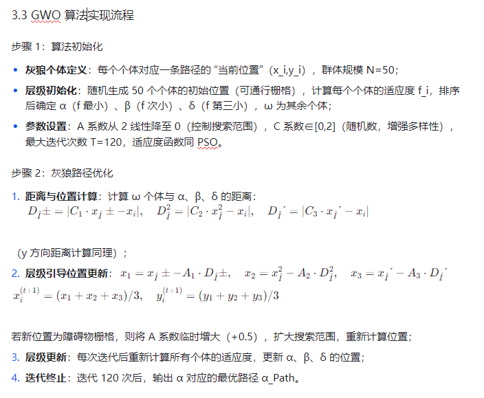 GWO 算法将每个 “路径候选解” 视为 “灰狼个体”,通过 α(最优解)、β(次优解)、δ(第三优解)引导 ω(普通个体)调整位置,实现路径优化。其在栅格路径规划中的适配性体现在: