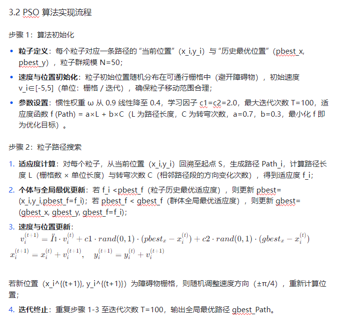 - 单一 PSO 算法:粒子群优化(PSO)通过群体协作搜索路径,全局探索能力强,但易因 “粒子聚集” 陷入局部最优(如障碍物包围的局部最优区域),且路径平滑性差(粒子随机移动导致频繁转弯);
