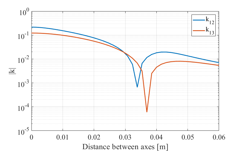 此脚本用于计算线圈阵列中的耦合。所考虑的阵列由三个空气核心圆形线圈组成,它们的中心位于三角形的边上。耦合被计算为线圈之间轴距的函数。在轴距值小于线圈直径时,它们之间会有部分重叠。在这种情况下,垂直分离被设置为输入参数之一。线圈1被认为是堆栈的顶部,线圈2在中间,线圈3在底部。线圈1和2之间的垂直分离与线圈2和3之间的垂直分离相同