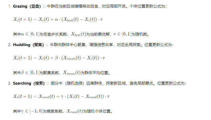 NSOX 算法基于牛群的自然行为( grazing、huddling、searching ),结合非支配排序与拥挤度计算,实现多目标优化。其核心是将牛群的寻优机制与多目标解的评价准则融合,在解空间中高效搜索 Pareto 最优解。