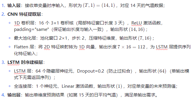 单变量时序预测的 “单输入单输出” 模式,指仅以某一变量的历史时序数据为输入(如每日气温),输出该变量未来某一时刻的预测值(如次日气温)。CNN-LSTM 通过 “卷积特征提取 + 循环时序建模” 的串联结构,精准适配此类场景,核心逻辑如下: