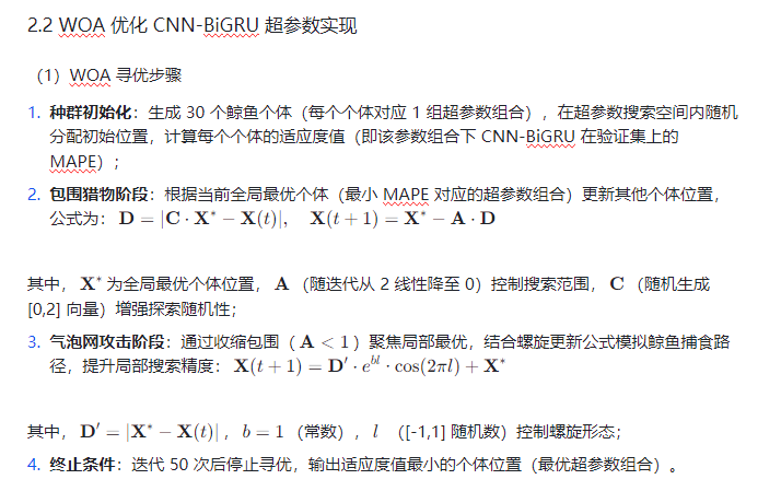 - WOA(鲸鱼优化算法):模拟座头鲸 “包围猎物”“气泡网攻击” 的自然行为,将 CNN-BiGRU 的待优化超参数(如卷积核尺寸、BiGRU 隐藏层神经元数、学习率)映射为 “鲸鱼个体位置”,通过迭代寻优找到最优参数组合,解决人工调参效率低、精度波动大的痛点;