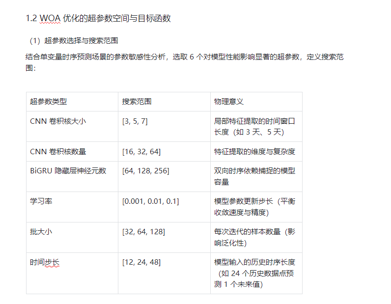 - 协同优势:WOA 为 CNN-BiGRU 提供最优参数配置,CNN 解决 BiGRU “局部特征感知弱” 的问题,BiGRU 弥补 CNN “时序依赖捕捉单向” 的缺陷,三者形成 “优化 - 提取 - 建模” 的闭环,适配单变量时序预测的核心需求。