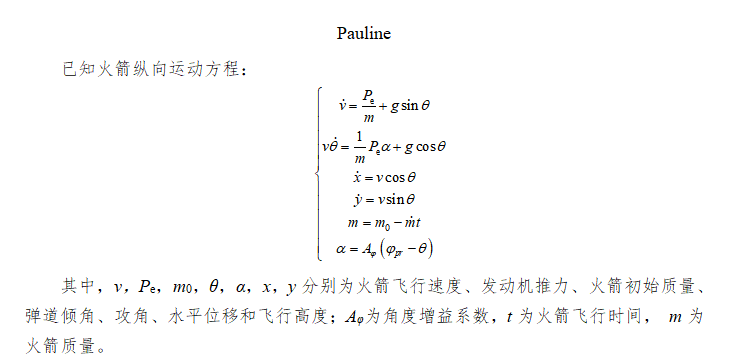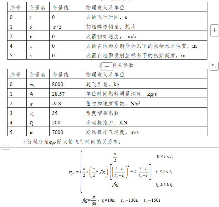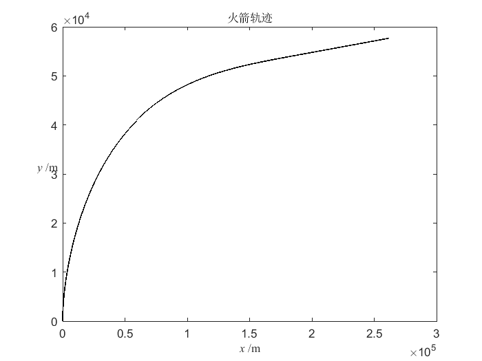 4706.73m/s;火箭轨迹呈抛物线型,与程序角函数相适应;攻角绝对值最大不超过17°;切向力随时间变化与教材插图大致吻合;轴向过载最大为5.49,法向过载最大为1.0175,较符合安全标准。