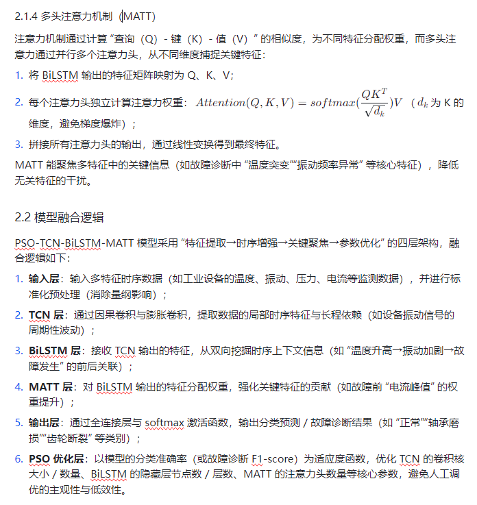 粒子群优化算法(PSO)凭借高效的全局寻优能力,可解决模型参数优化难题;时间卷积神经网络(TCN)擅长捕捉时序数据中的局部依赖关系与长期趋势;双向长短期记忆神经网络(BiLSTM)能同时从正向和反向挖掘时序特征的上下文信息;多头注意力机制(MATT)则可聚焦关键特征,增强模型对重要信息的敏感度。将四者融合构建PSO-TCN-BiLSTM-MATT 模型,既能突破单一模型的局限性,又能通过 PSO 优化核心参数,显著提升多特征分类预测与故障诊断的精度和稳定性。