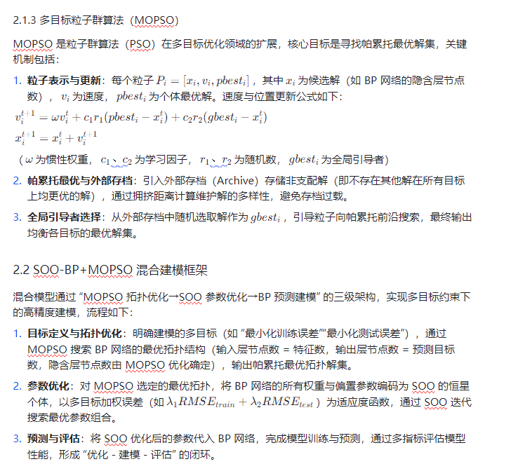 本文提出 “SOO-BP+MOPSO” 混合建模框架:先用 MOPSO 解决 “模型精度 - 泛化能力” 等多目标优化问题,确定 BP 神经网络的最优拓扑结构(如隐含层节点数);再通过 SOO 算法优化 BP 网络的权重与偏置参数,破解传统 BP 的局部最优陷阱。以 “工业锅炉燃烧效率预测” 为案例,基于 Matlab 实现全流程建模,通过多指标评估与可视化分析,验证该混合模型在多目标场景中的工程应用价值。