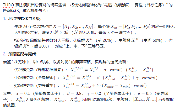 田忌赛马优化算法(THRO)作为 2024 年提出的新型元启发式算法,借鉴 “以弱胜强、全局统筹” 的博弈策略,通过 “马匹分级 - 策略匹配 - 迭代进化” 机制实现多约束优化,在多主体协同问题中表现出优于传统算法的解质量与收敛速度。其核心优势在于将多目标优化转化为 “资源 - 任务” 的动态匹配问题,天然适配多无人机 “个体能力 - 路径任务” 的协同需求。