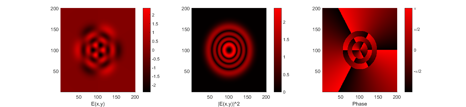 - 透射式干涉:LG 光束垂直入射叉形全息图,透射光包含零级衍射光(未调制基模)与 ±1 级衍射光(携带全息编码相位的涡旋光),三者在远场形成干涉条纹;