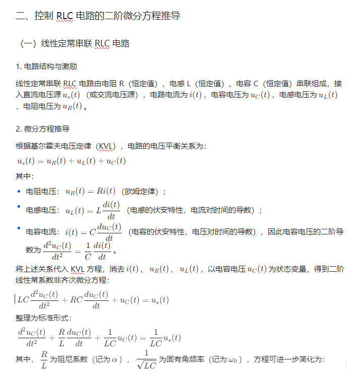 控制 RLC 电路(电阻 - 电感 - 电容串联 / 并联电路)是电子系统中的基础核心电路,广泛应用于信号滤波、振荡发生、电源稳压、通信调制等领域 —— 例如,射频通信中的带通滤波器、数字电路中的时钟振荡电路、电力系统中的谐波抑制电路,其工作原理均依赖 RLC 电路的动态响应特性。RLC 电路的行为遵循二阶线性微分方程,其动态过程(如暂态响应、稳态响应)直接决定了电子系统的性能指标,如滤波精度、振荡频率稳定性、响应速度等。