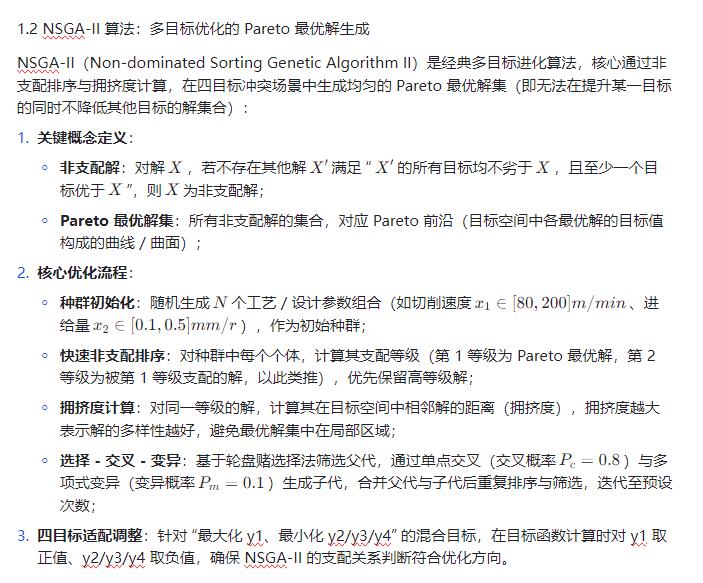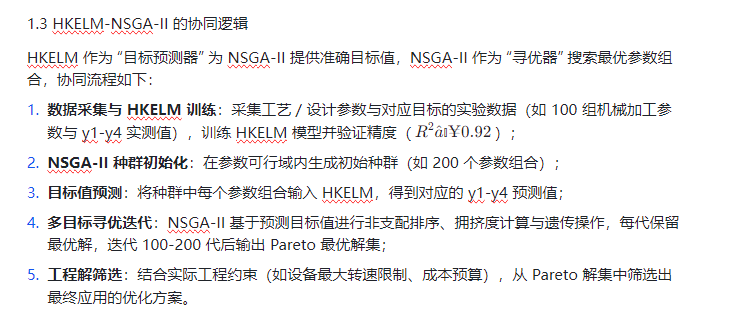 在工业制造(如机械加工工艺参数优化)、工程设计(如桥梁结构尺寸优化)等领域,多目标优化需求普遍存在且目标间多呈冲突关系 —— 例如机械加工中 “最大化加工效率(y1)” 常伴随 “最小化表面粗糙度(y2)、最小化能耗(y3)、最小化刀具磨损(y4)” 的目标冲突,传统优化方法(如加权求和法、线性规划法)存在两大核心局限:一是将多目标转化为单目标时易丢失最优解多样性,二是难以精准拟合目标与参数间的复杂非线性关系(如工艺参数与能耗的耦合关联)。而混合核极限学习机(HKELM) 结合多核函数优势,能高精度拟合多输入 - 多输出的非线性映射,为优化提供可靠目标预测模型;NSGA-II 算法通过快速非支配排序与拥挤度计算,可高效生成均匀分布的 Pareto 最优解集,二者协同构建 “高精度预测 - 多目标寻优 - 解的工程筛选” 的完整优化体系,为四目标优化需求提供科学解决方案。